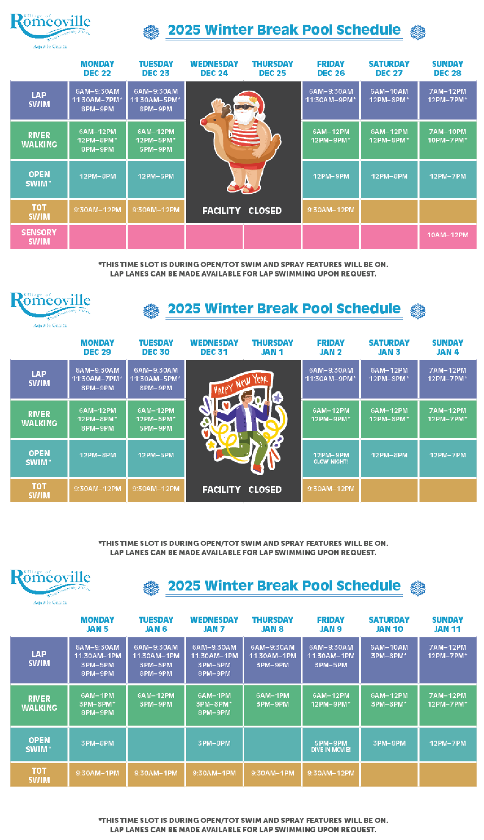 December is here, and we’ve lined up Aquatic Fitness Pop-Ups, extended Winter Break Hours, and the Jingle Bell Splash Bash! Get ready to splash, play, and stay active all month long at the Romeoville Aquatic Center.