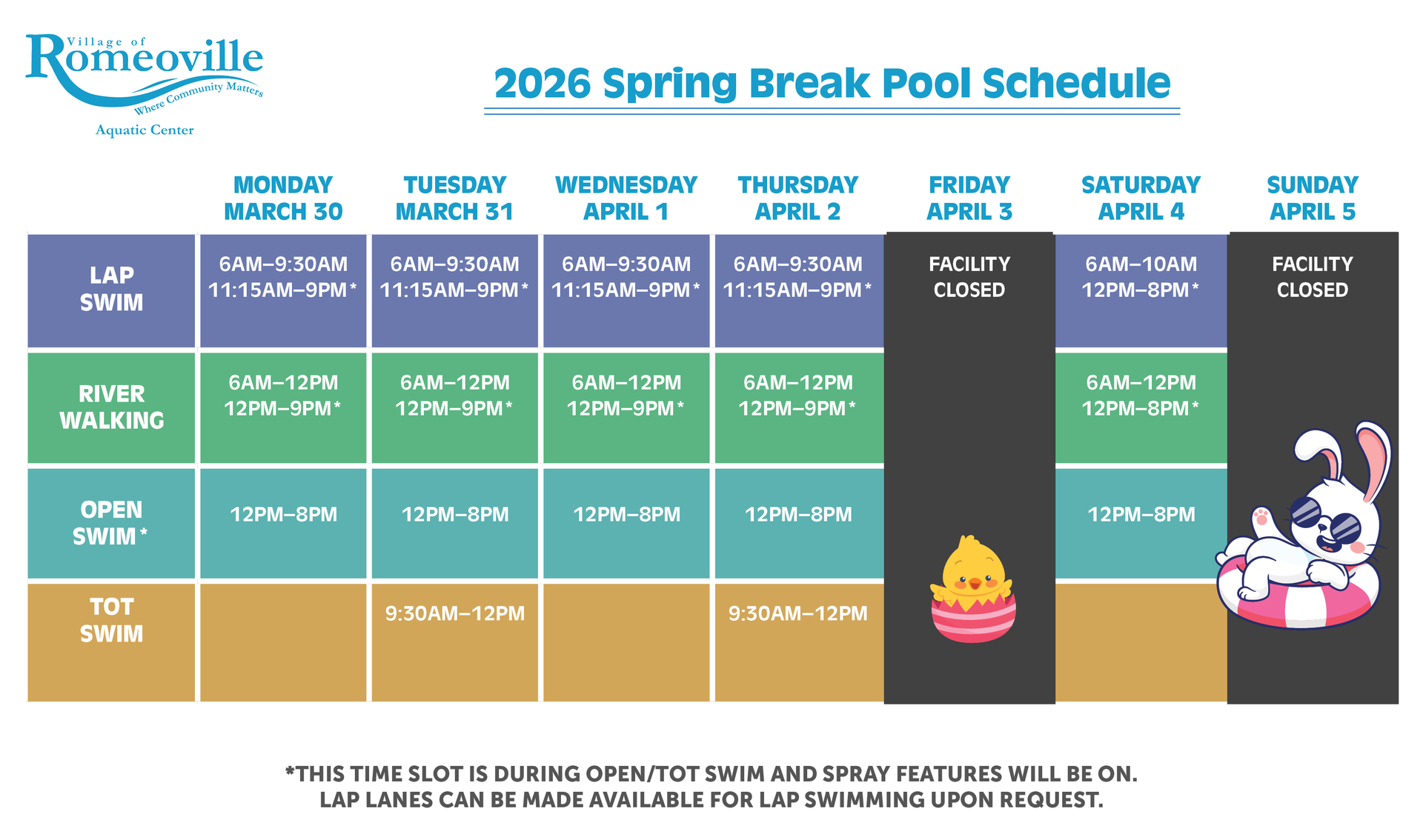 Spring is officially here, and April is the perfect time to dive into new routines and refreshing opportunities at the Romeoville Aquatic Center. From seasonal programs to important reminders, we’ve got everything you need to make a splash this month.